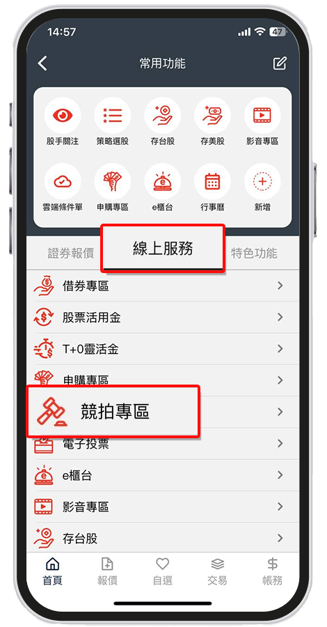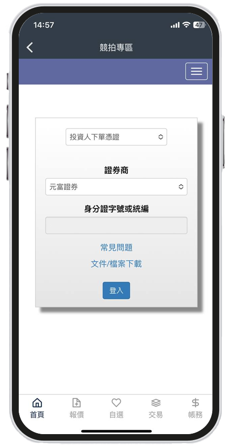 | 應注意事項 | (一)投標後投標單不得撤回或更改,投標前應審慎評估。 (二)投(得)標費用包括「投標處理費」及「得標手續費」,投標時繳交「投標處理費」,得標後繳交「得標手續費」,各標單應繳金額或比例請詳閱競價拍賣公告、承銷公告及依證券商通知辦理。 (三)投(得)標人應於繳款截止日內將應繳交之各項價款及費用繳存至往來銀行,由證券經紀商辦理扣款。 |